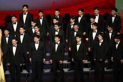 我校学生合唱团50多位成员着装整齐、精神饱满、意气奋发,歌声时而稳重沉静、时而高亢有力,把大家带入了音乐的海洋中,让在场的每一位观众感动着、震撼着、赞叹着。演唱结束后,观众们的掌声经久不息。